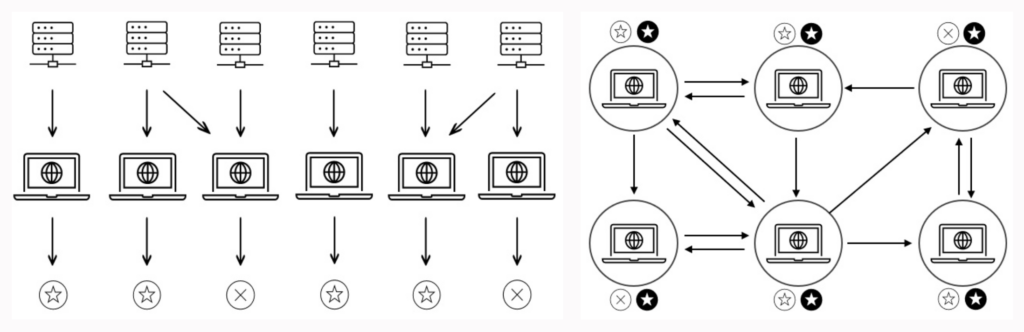- Communication phase. Participants transmit their initial predictions within the network according to a consensus/gossip protocol. During these exchanges, participants continuously update their predictions to reflect the assessments of the other network participants, as well as the confidence in their own predictions. Additionally, a participant can monitor the quality of predictions received from the rest of the network, and use this to improve decision-making. At the end of this phase, participants come to agreement (“consensus”) on the decision deemed optimal given the information available within the network. This phase is then repeated for any new data inputs.