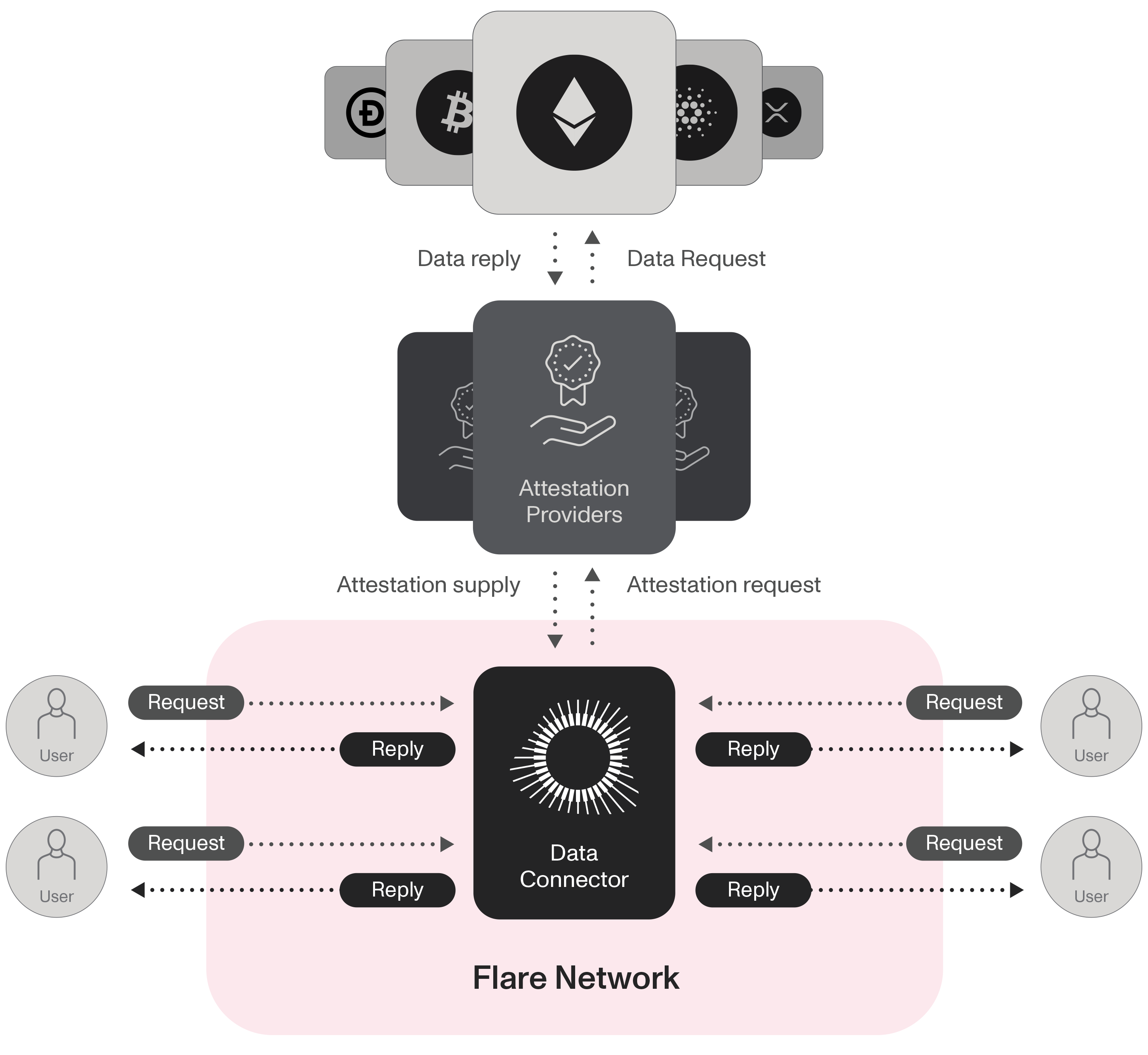 The Data Connector uses a set of independent attestation providers which fetch the required information from other blockchains and deliver it to the Flare network. The Data Connector smart contract then checks if there is consensus among the received answers, making the results available to the network if so.