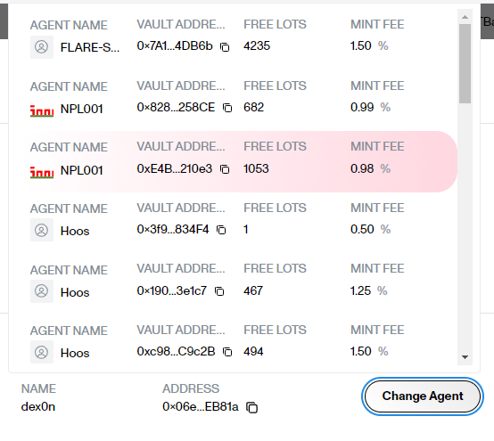 - Mint Fee: This is the commission you will pay to agents for minting FAssets. For instance, if an agent fee is 0.25%, minting 20 FTestXRP will require a 0.05 FTestXRP fee.