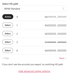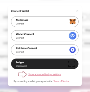 - If you have multiple addresses, select “Connect” again and then “Show advanced Ledger settings” to choose other addresses using Ledger Live or BIP44 derivation chains.